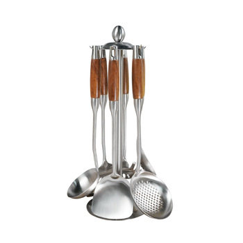 Juego de utensilios de cocina de acero inoxidable de 7 piezas con mango de madera resistente al calor y organizador de soporte giratorio para uso en la cocina